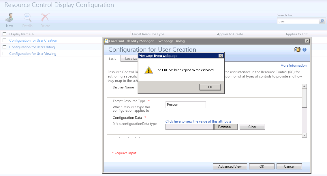 2. On the FIM Portal Server, perform an IISRESET, and check that your Configuration for User Creation and Configuration for User Editing RCDC objects are functional once more.